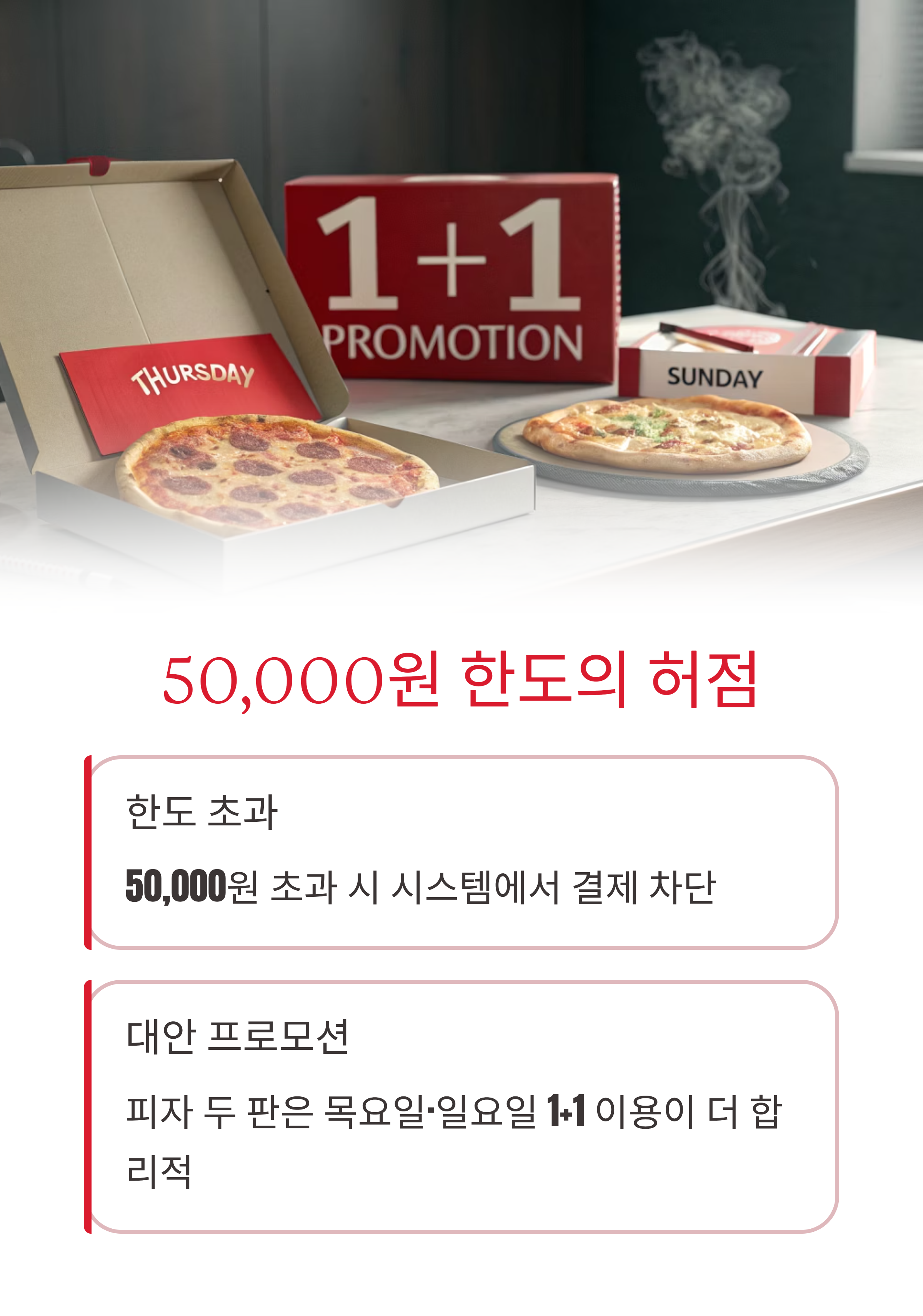 50,000원을 초과해 주문할 경우 시스템에서 결제를 막습니다.