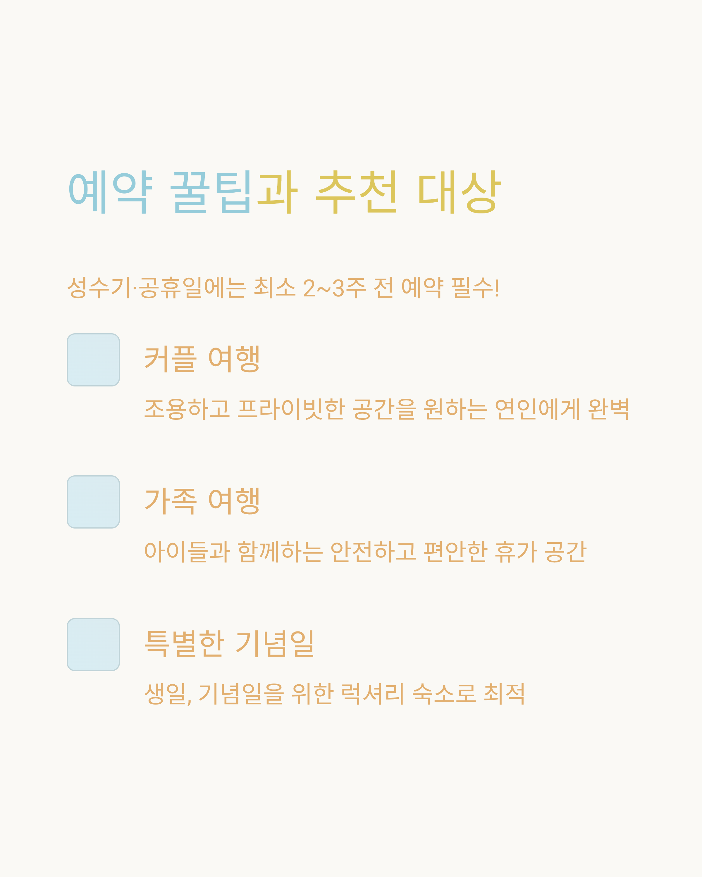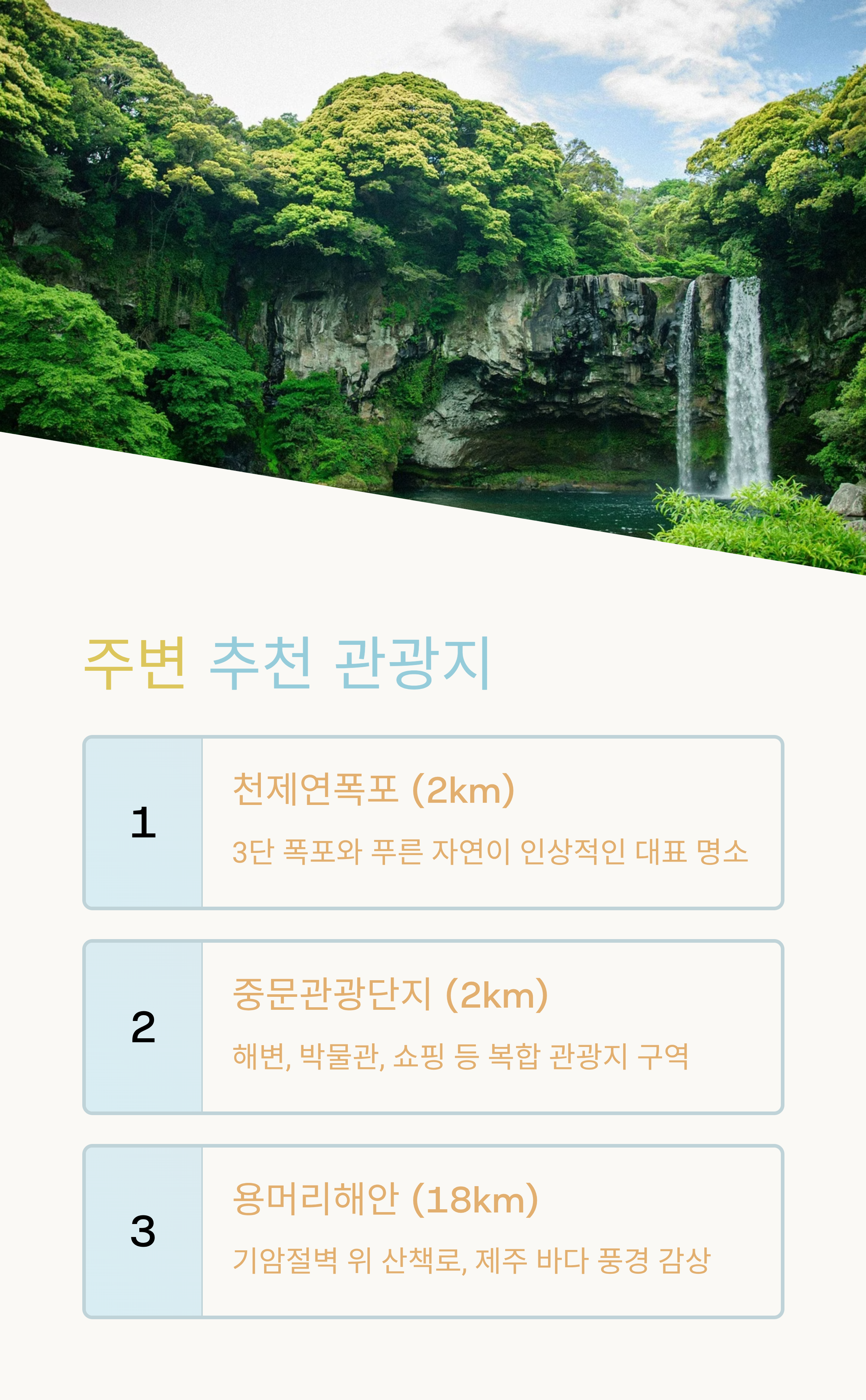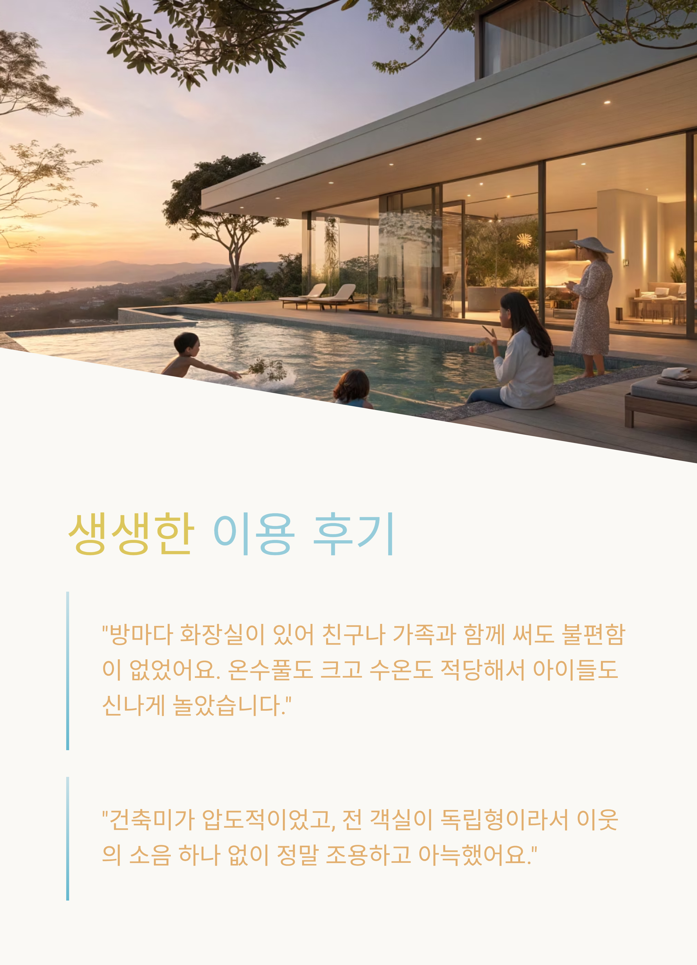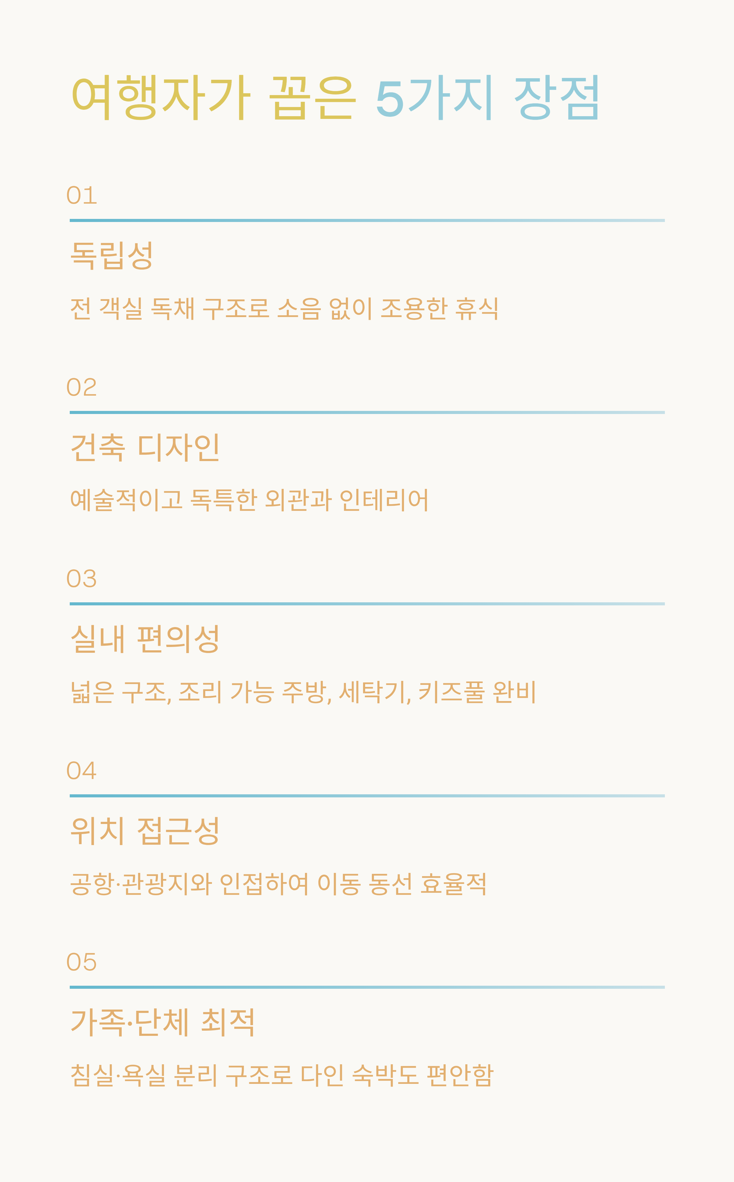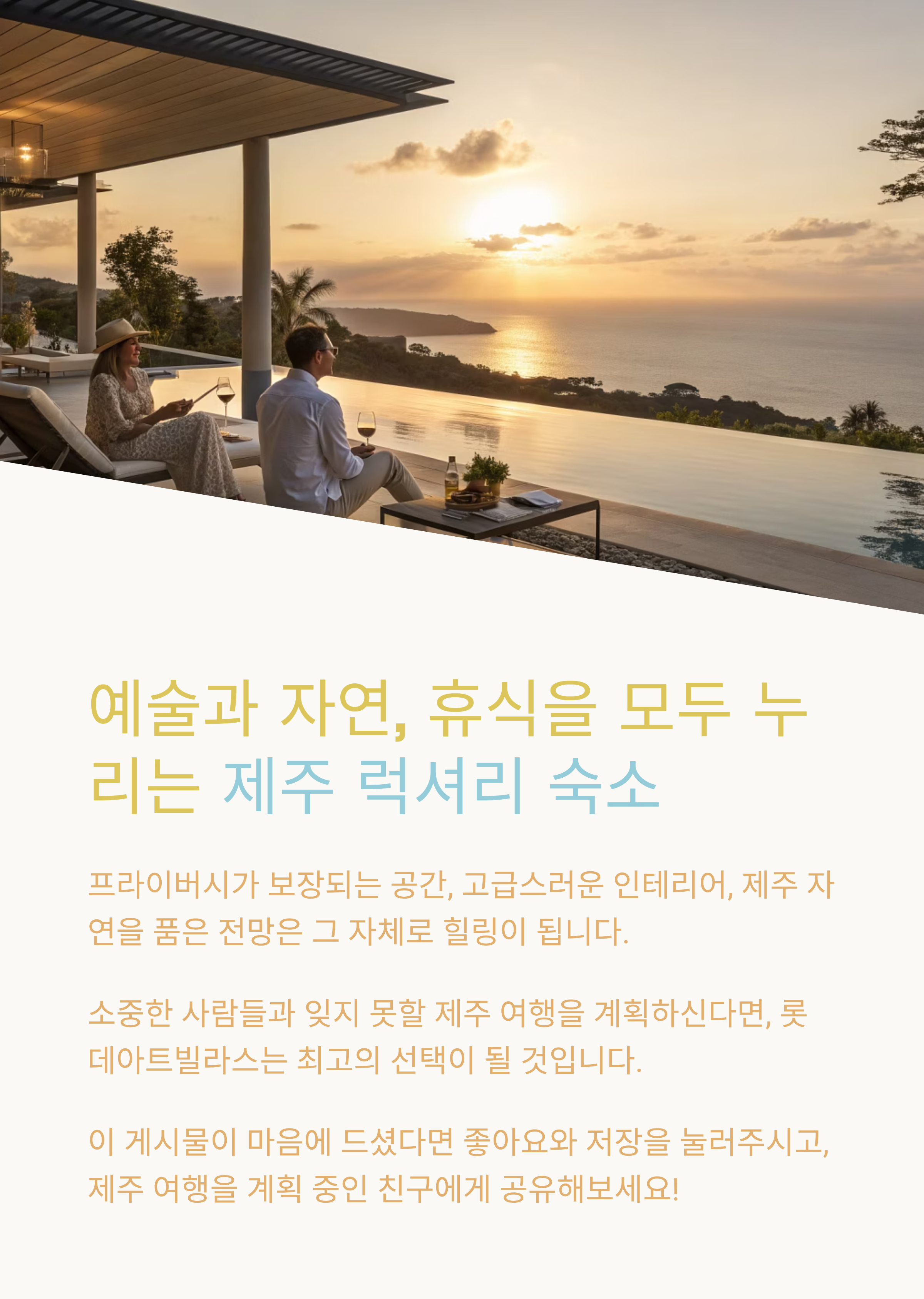 제주 롯데아트빌라스는 숙소 이상의 가치를 지닌 공간으로, 고요한 자연 속에서 완벽한 프라이빗 휴식을 제공합니다. 감각적인 디자인과 청결한 시설, 편안한 구조까지 더해져 기억에 남는 제주 여행을 완성해줍니다. 특별한 사람들과의 소중한 시간을 계획하고 있다면, 이곳은 최고의 선택이 될 것입니다.
