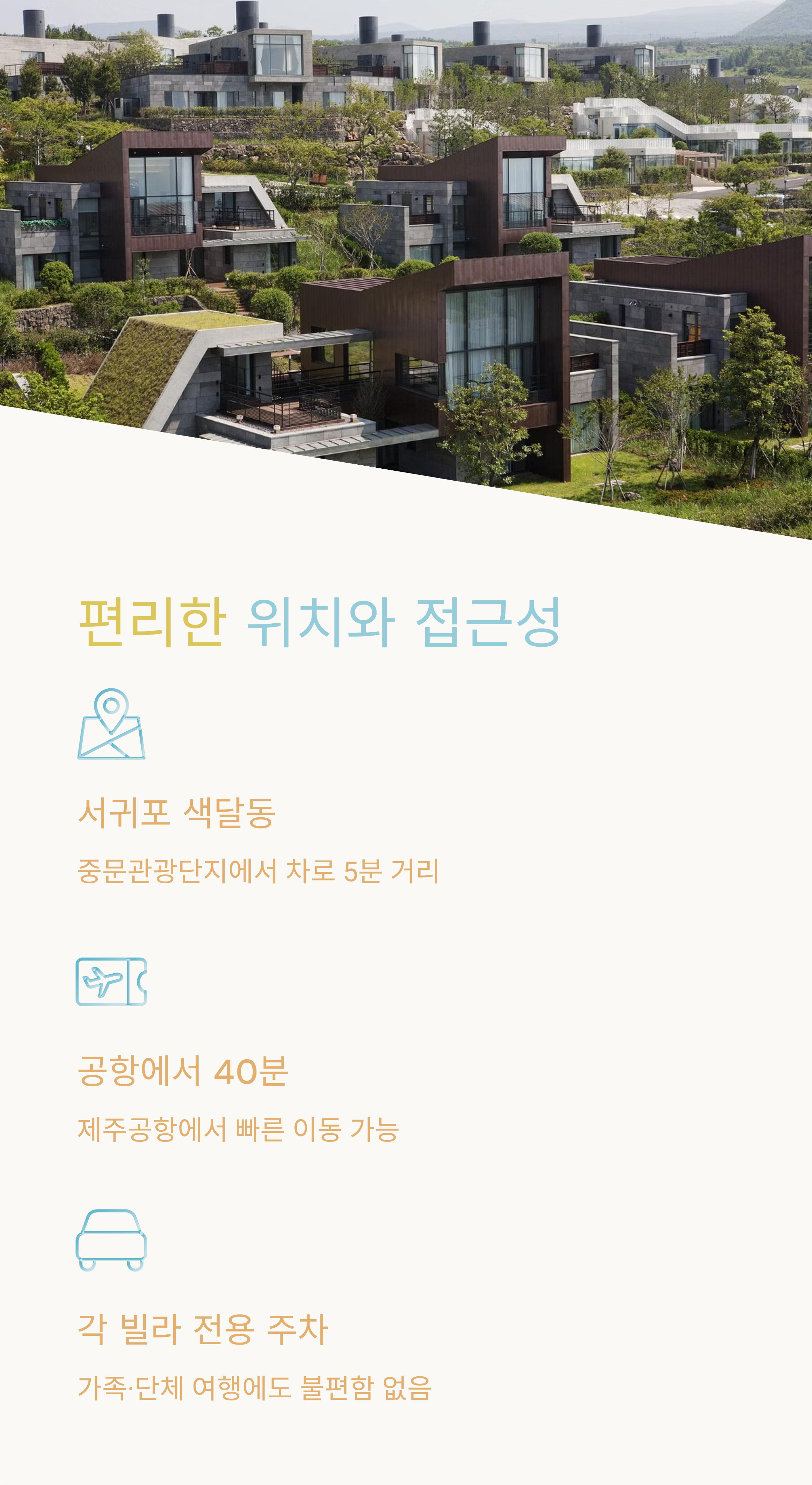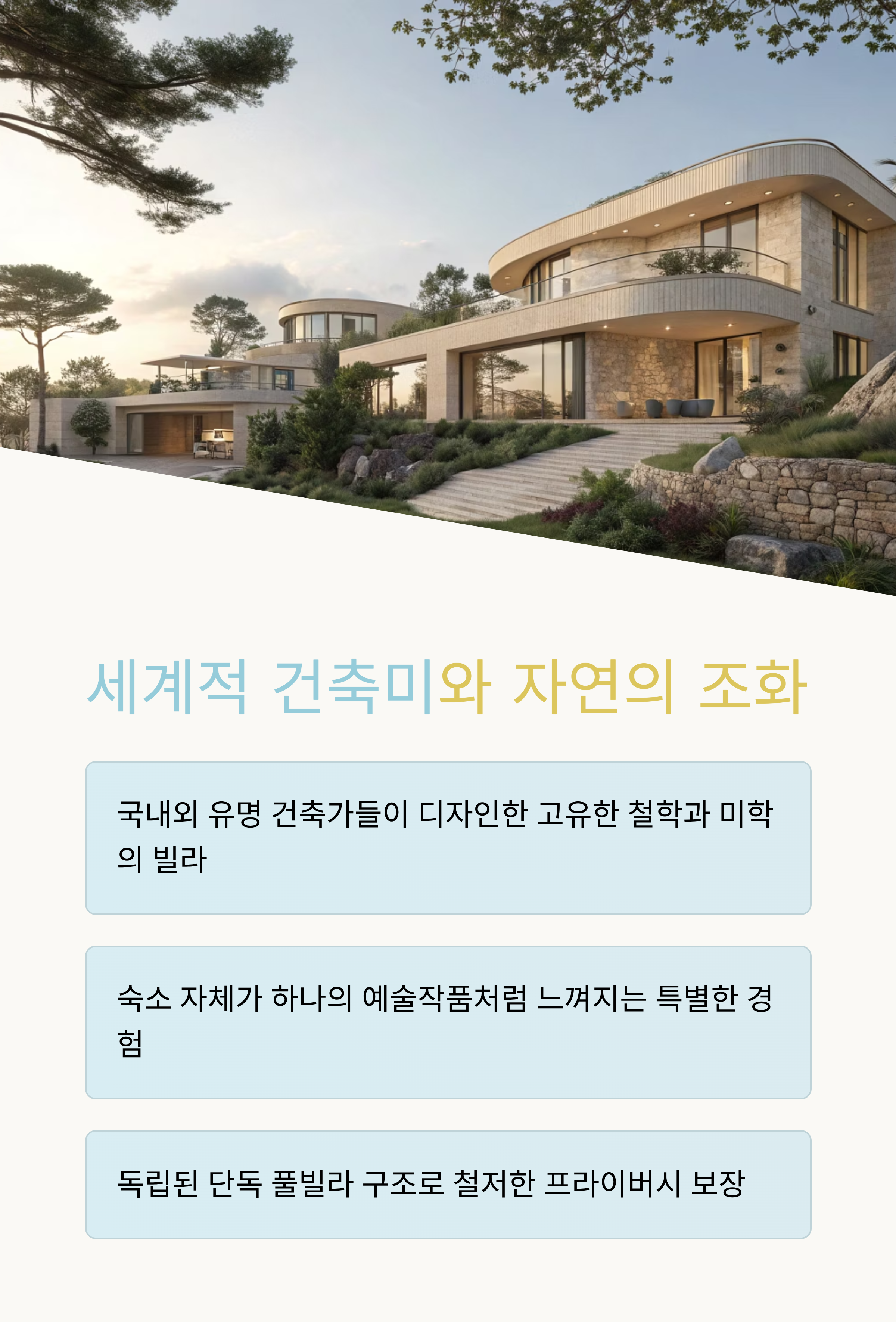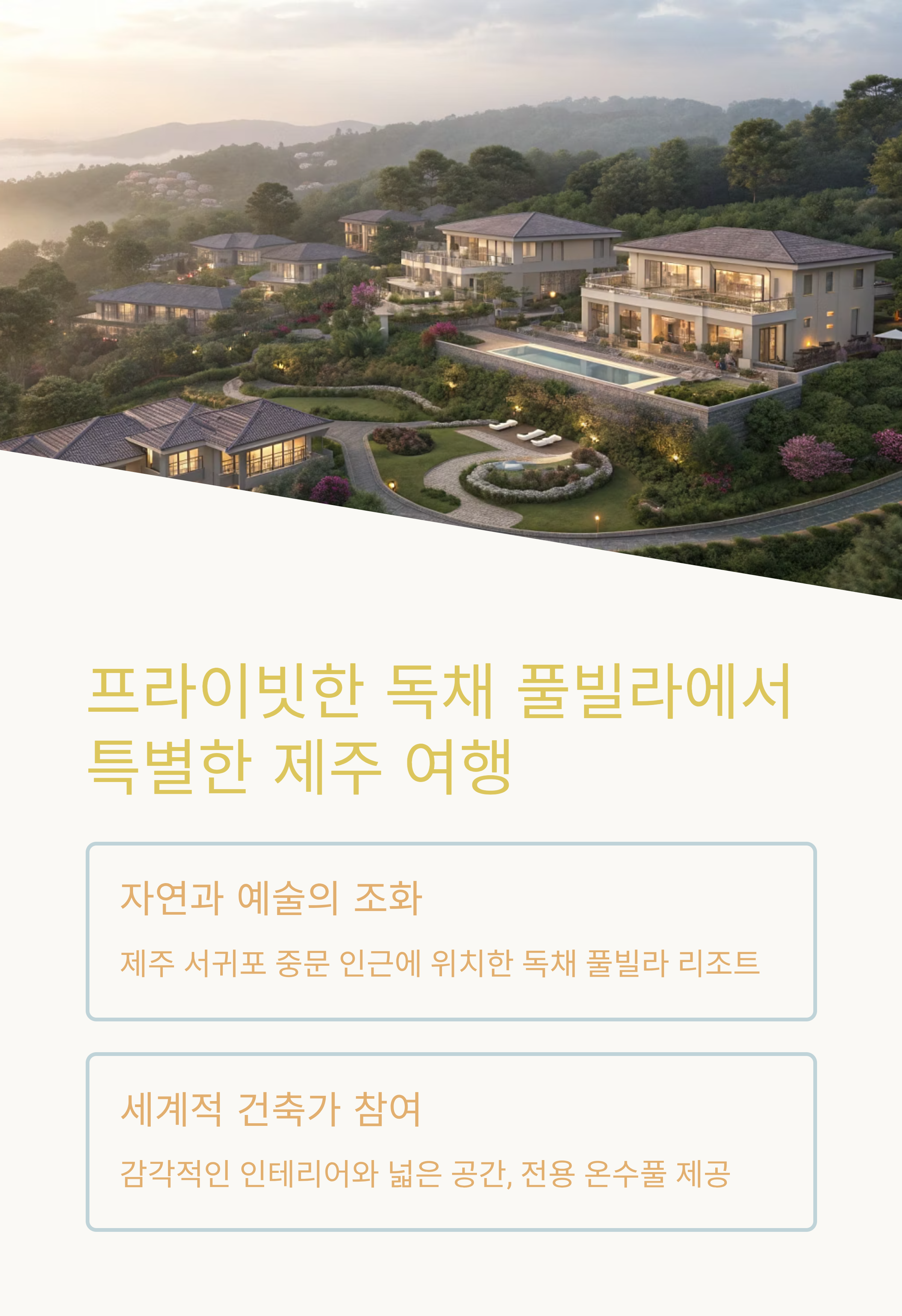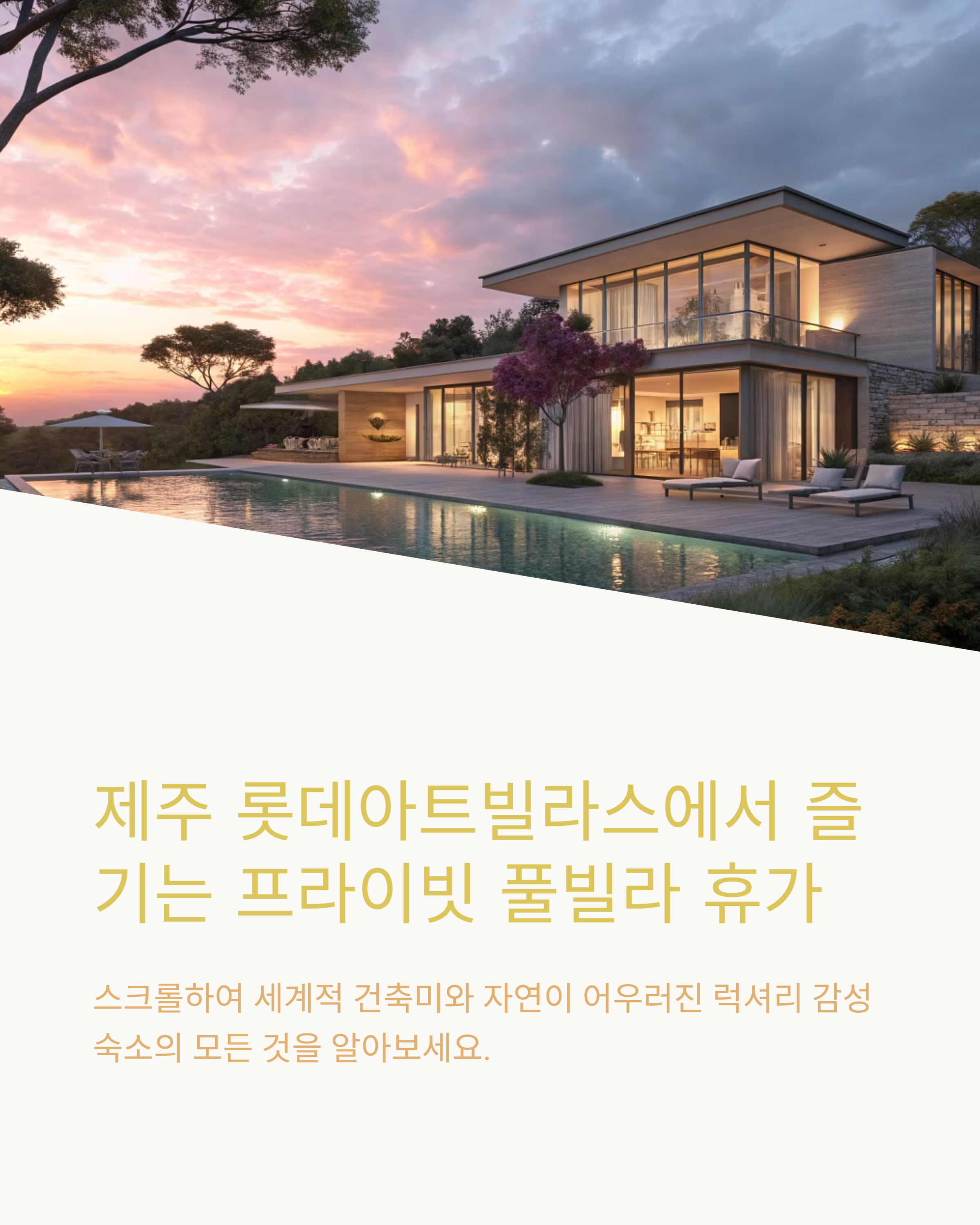 제주 롯데아트빌라스는 세계적 건축미와 프라이빗한 독채 풀빌라가 조화를 이루는 럭셔리 리조트입니다. 제주 서귀포 중문 인근에 위치해 접근성이 뛰어나며, 각 빌라마다 개별 온수풀과 예술적인 인테리어로 완벽한 힐링 여행을 제공합니다. 가족여행, 커플 휴가, 기념일 숙소로 최적화되어 있으며 자연과 예술, 고급스러움을 동시에 누릴 수 있는 프리미엄 감성 숙소입니다.