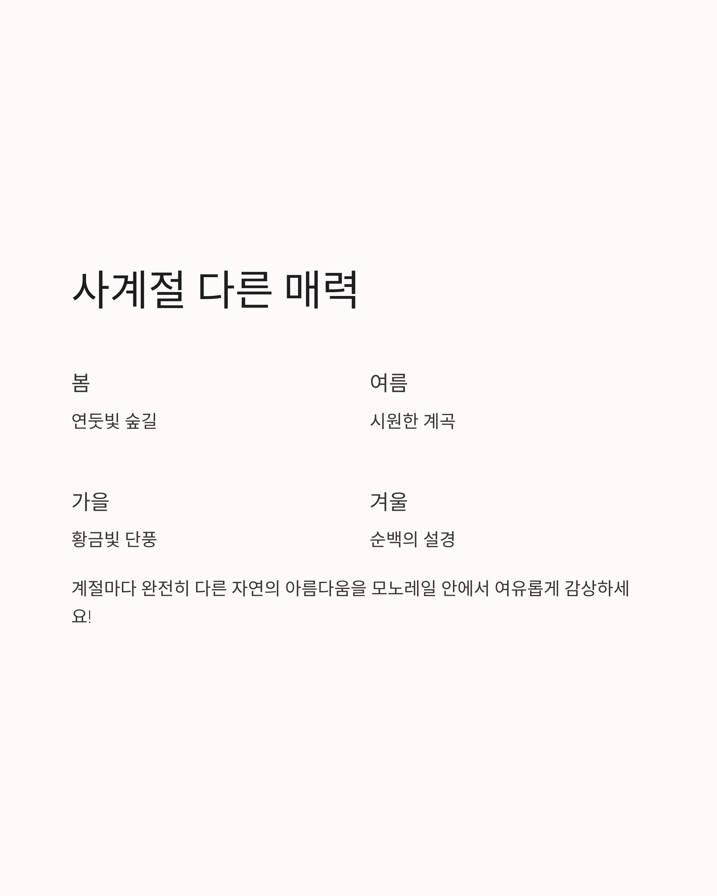남녀노소 모두 즐길 수 있는 사계절 힐링 관광코스로 인기가 높습니다.