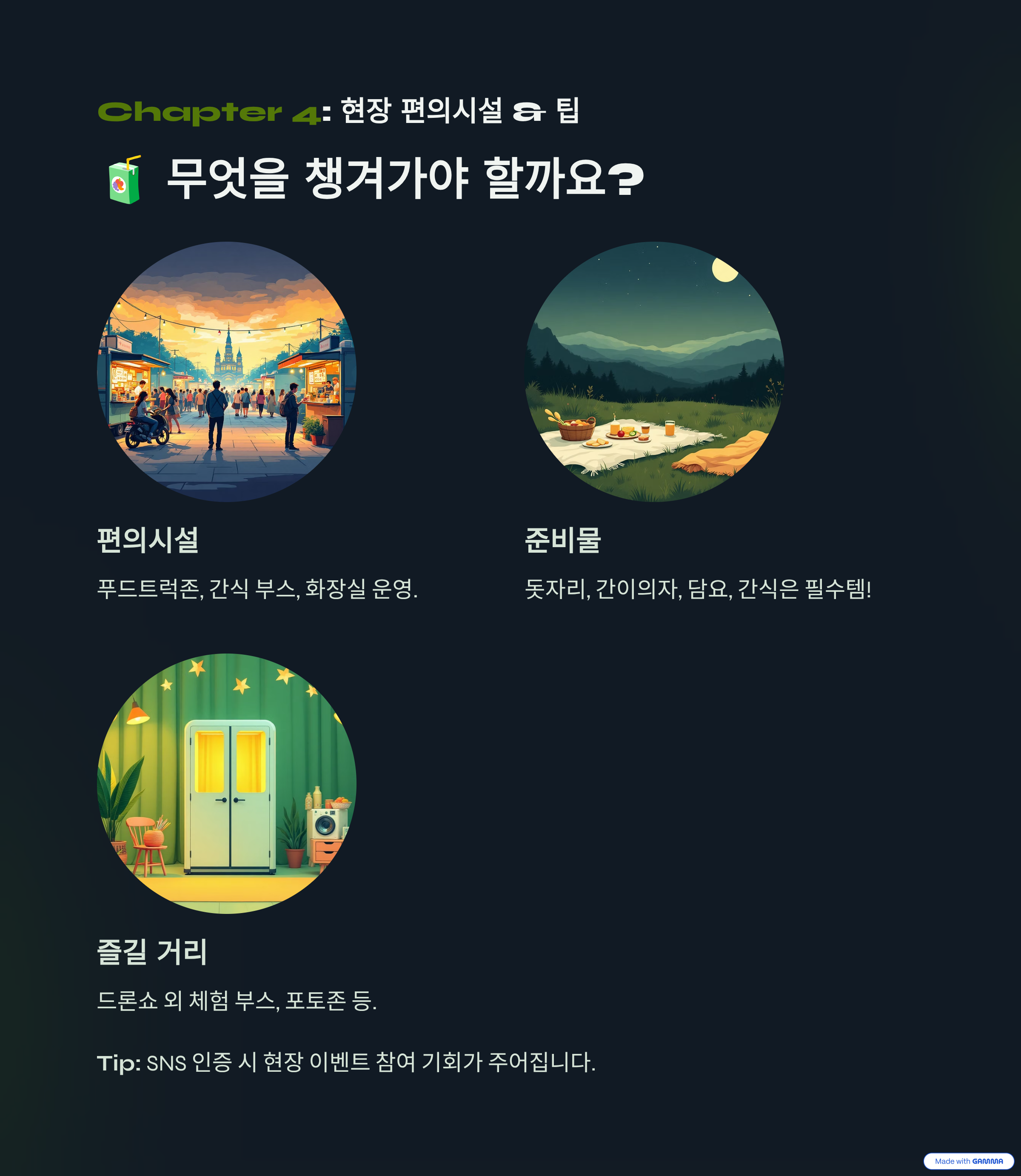 🧃 현장에는 뭐가 있나요? — 편의시설 & 관람 팁
