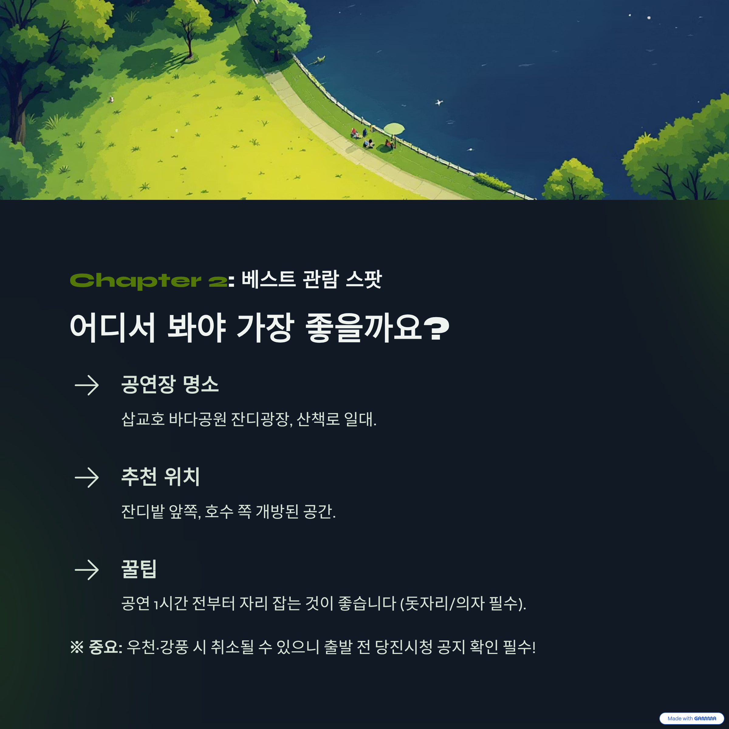 * 관람 추천 위치: 잔디밭 앞쪽, 호수 쪽 개방된 공간