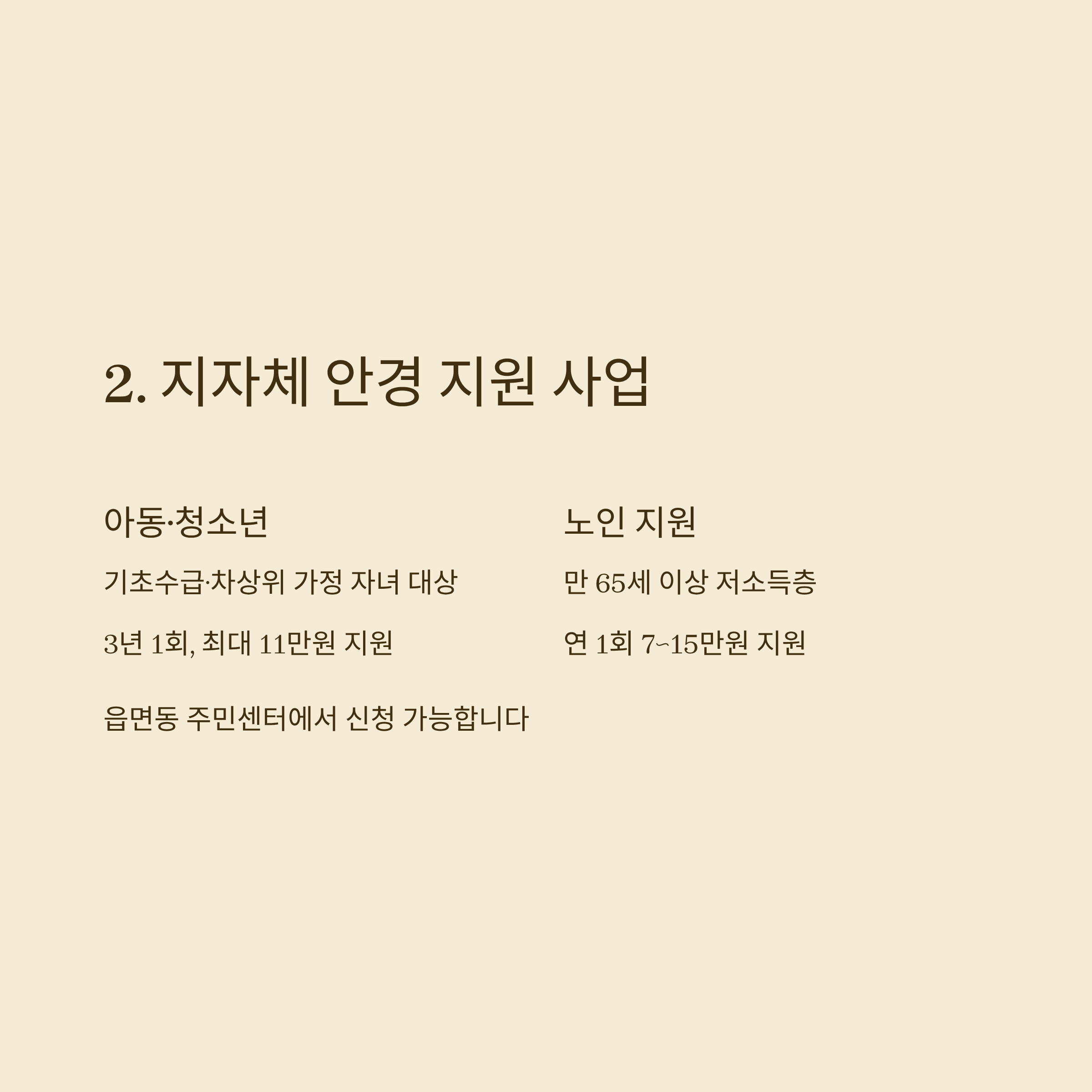 둘째, 저소득층 아동과 노인을 위한 지자체 안경 지원도 있어요