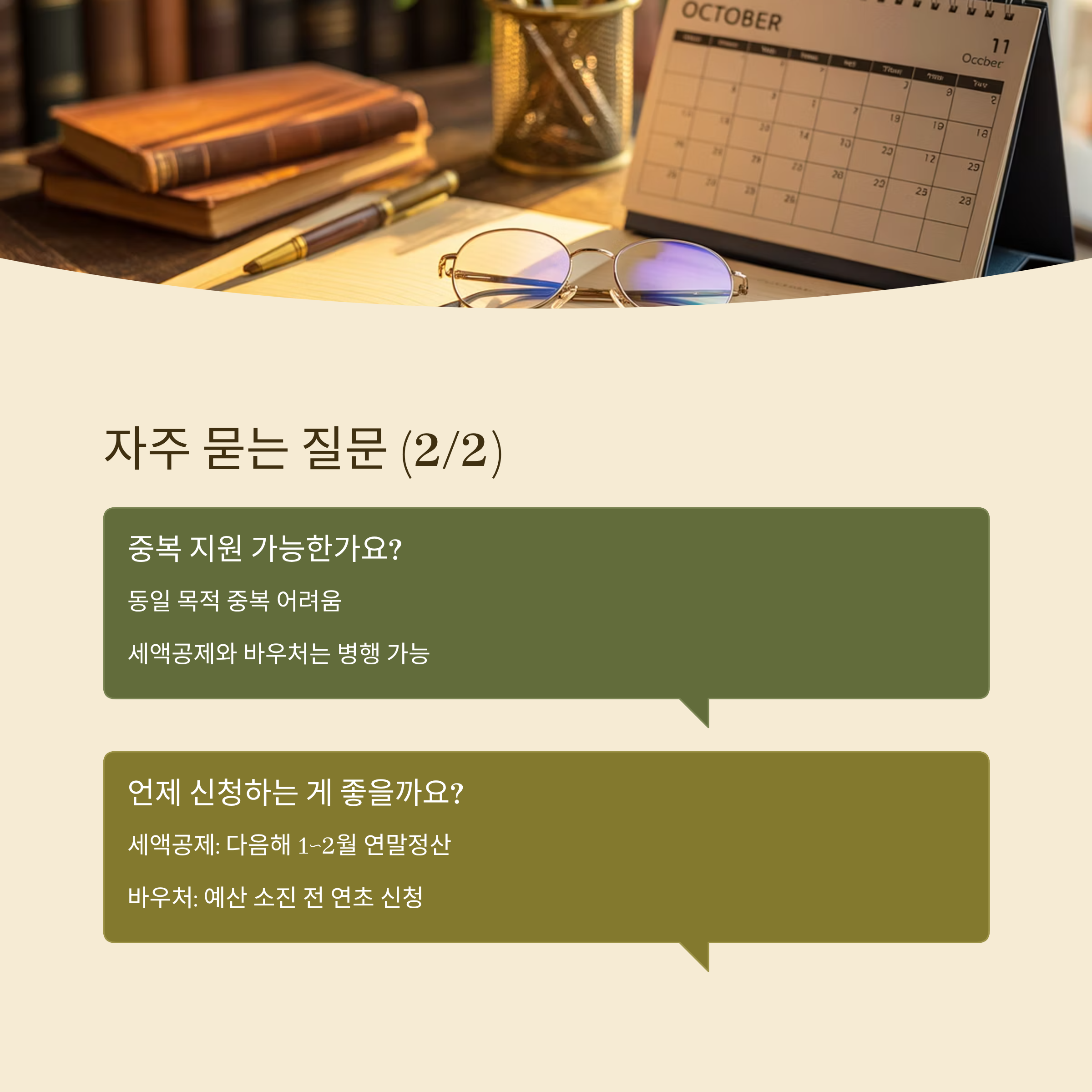 동일 목적에 대한 중복지원은 어렵지만, 세액공제와 바우처는 병행 가능합니다.