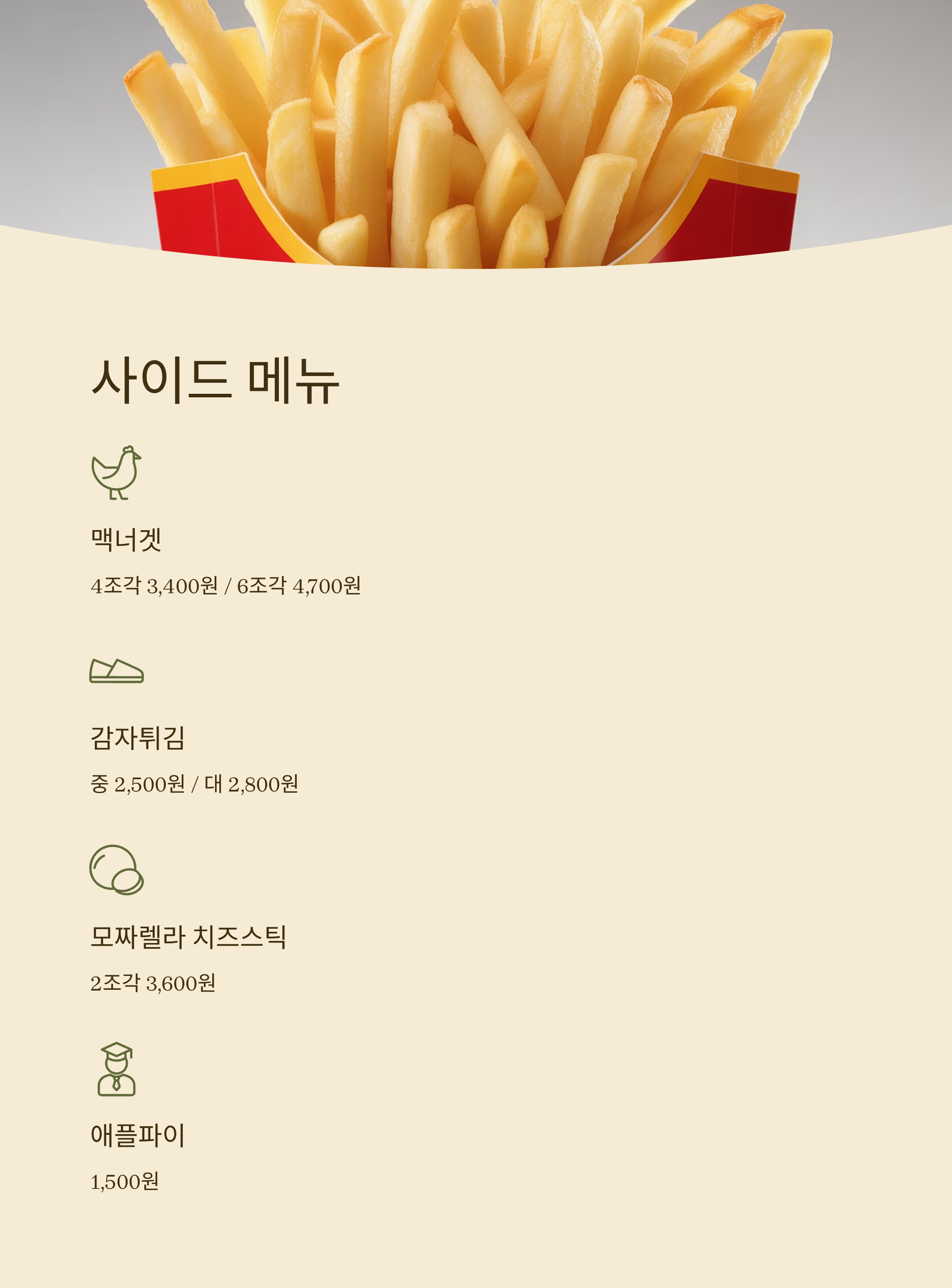 감자튀김 중 2500원 대 2800원