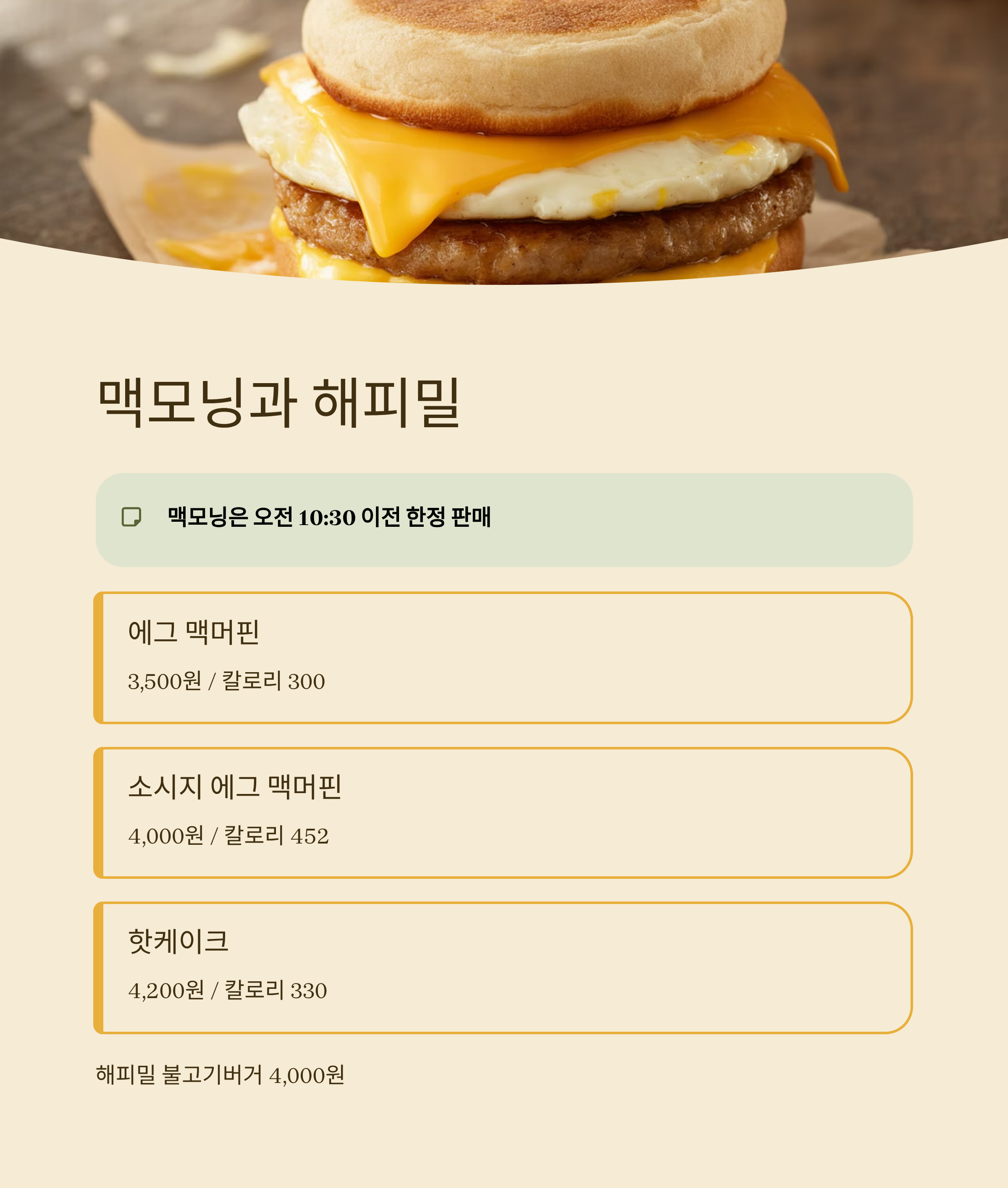 맥모닝은 오전 열시 삼십분 이전에만 판매되는 아침 한정 메뉴로 부드러운 식감과 간편한 구성이 특징입니다